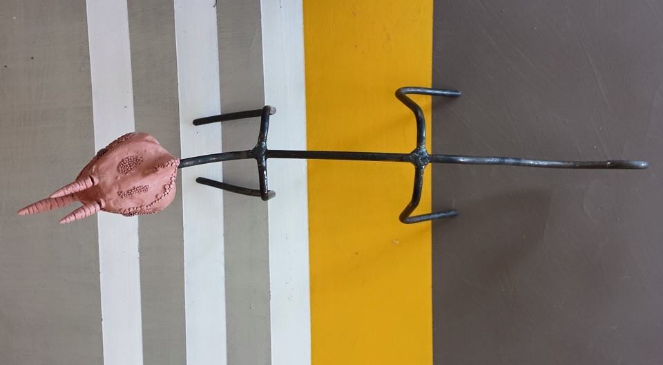 Davit Nava, Jackson chameleon, 2015, iron structure, post-use plastic bags, used clothing with white glue, acrylic on clay, crystal beads, 18.9 x 7.0 x 6.6 in / 48 x 18 x 17 cm