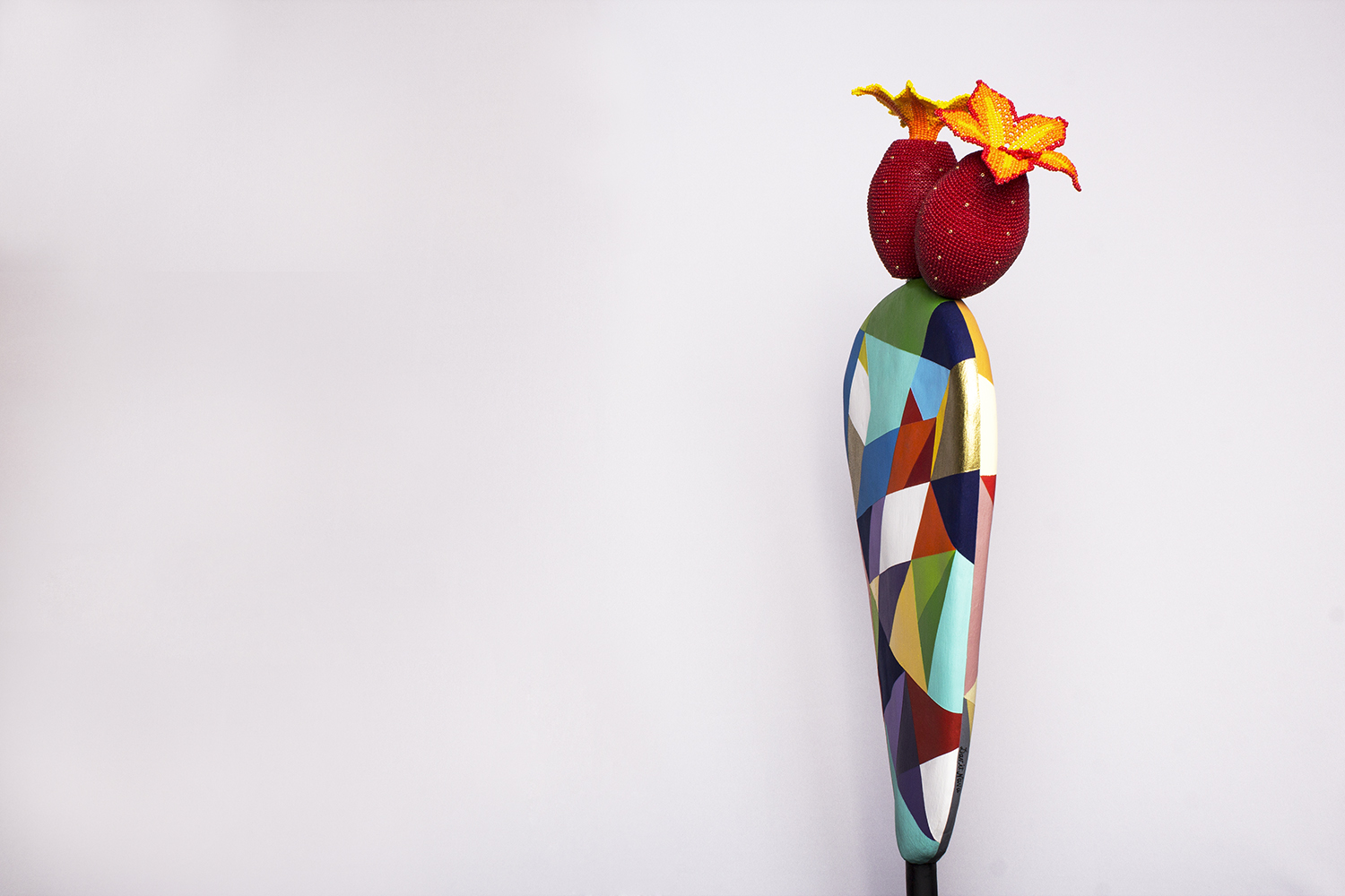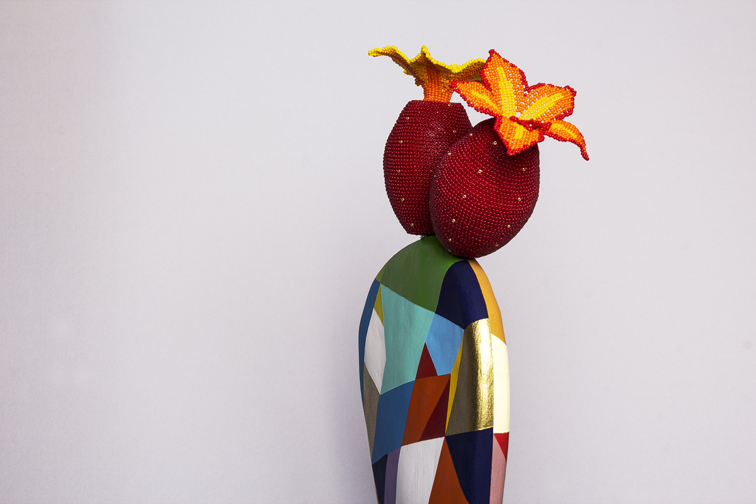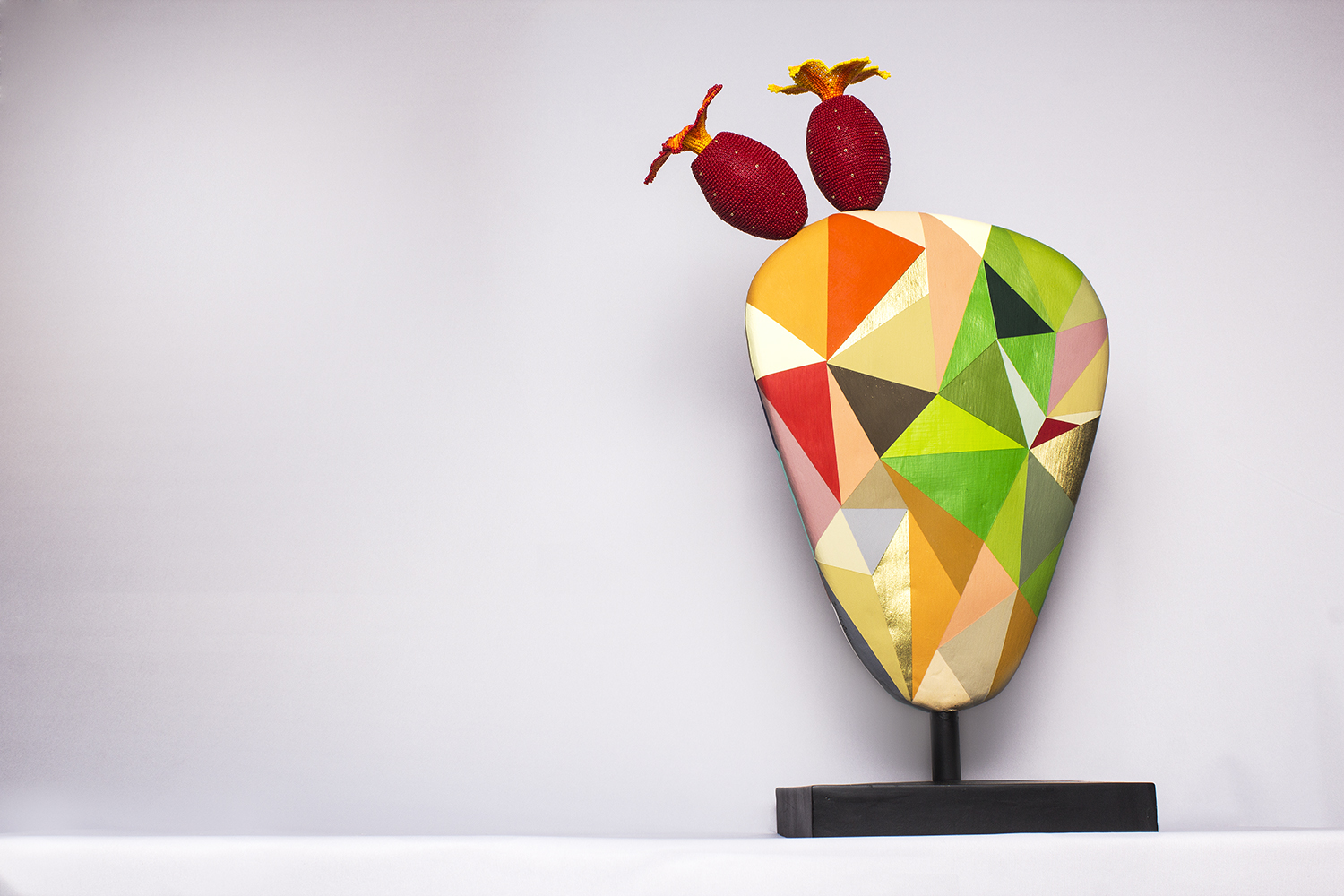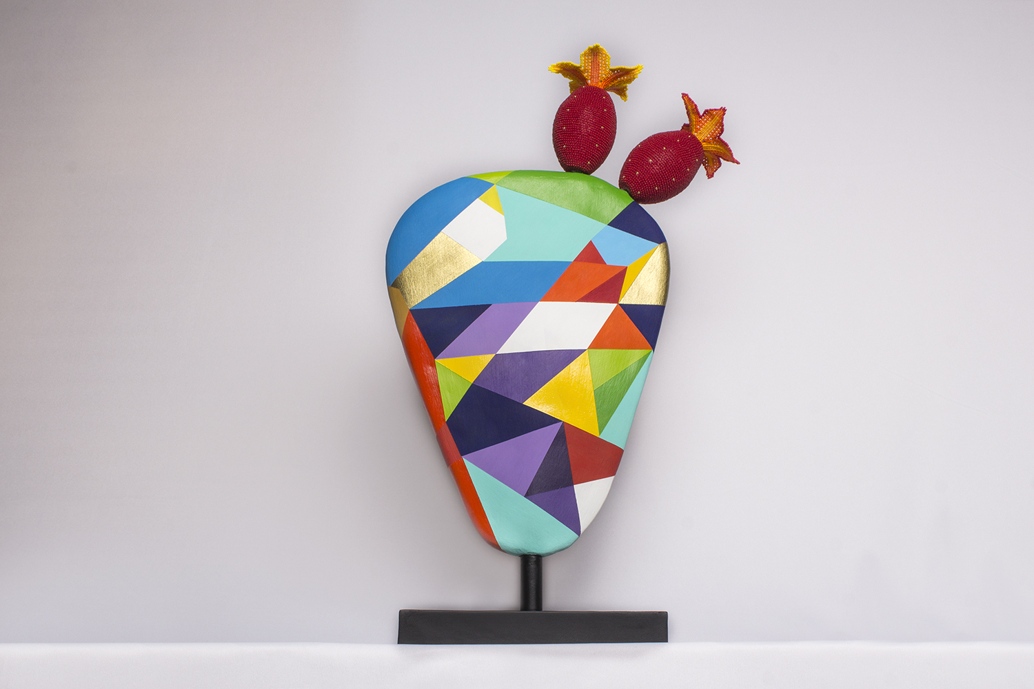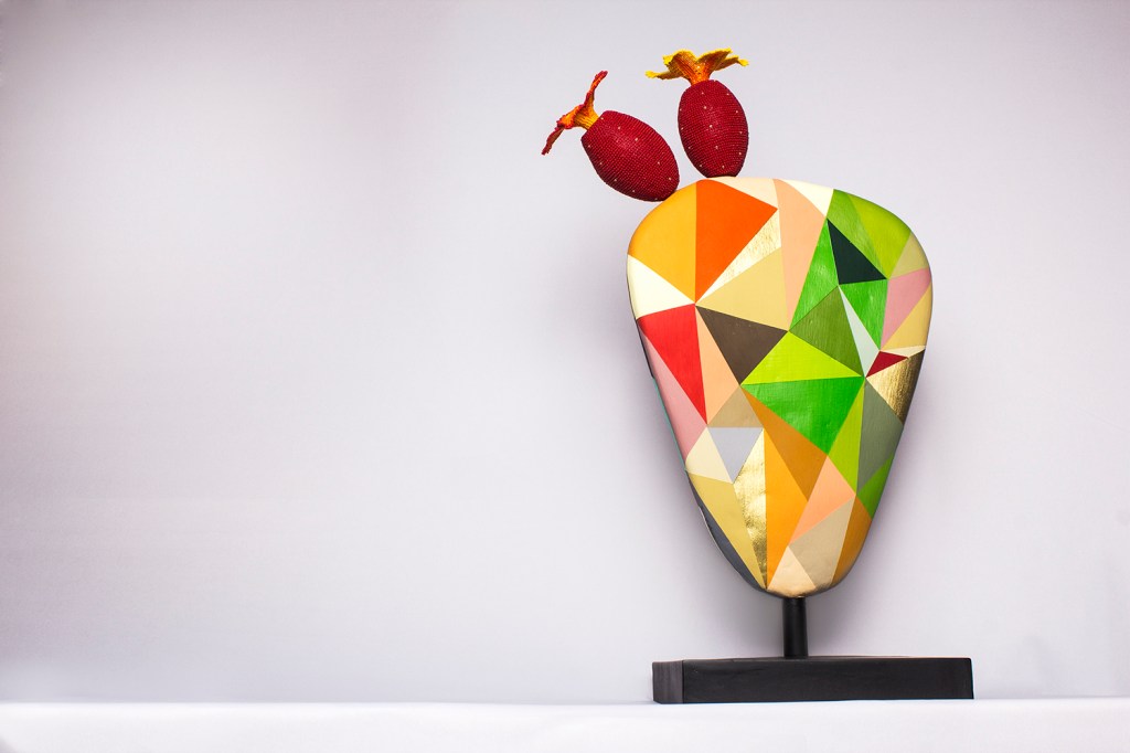 The Nopal leaf is an abstract sculpture, each side with a different color scheme. The two “tunas” – or prickly pears – are made out of clay, covered with crystal beads and a crystal bead flower. The flowers are Wixáritari beadwork.