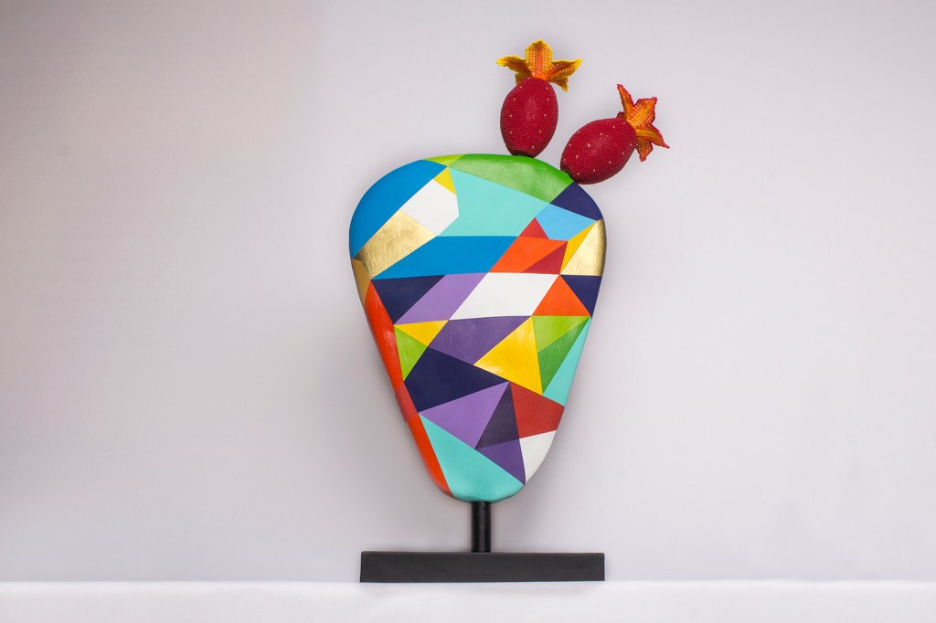 The natural shape of the Nopal leaf is painted in colorful, abstract forms as a kaleidoscopic metaphor representing the diversity of the vast number of ancient and modern cultures that inhabit Mexico today, as well as their world visions.