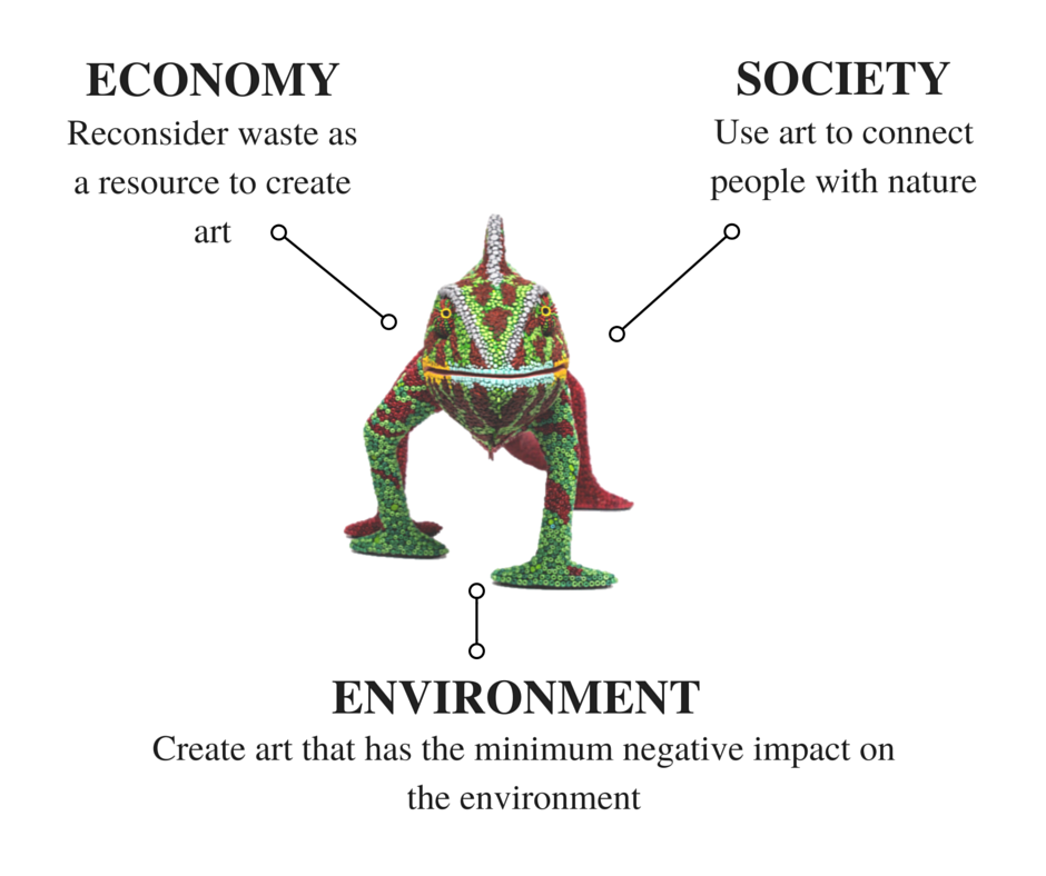 But for an art piece to be considered sustainable, it must meet the three pillars of Sustainability: economy, society, and environment. My artwork’s approach towards Sustainability can be summarized in the following points and diagram: